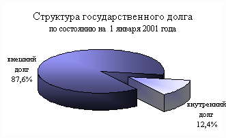 Государственный долг Российской Федерации на 1 января 2001 года составил 4479,7 млрд. рублей (63,4% к объему ВВП), в том числе внутренний долг – 557,4 млрд. руб. (7,9% к ВВП) и внешний долг – 144,5 млрд. долл. США (3922,3 млрд. руб., или 55,5% к ВВП). [25]