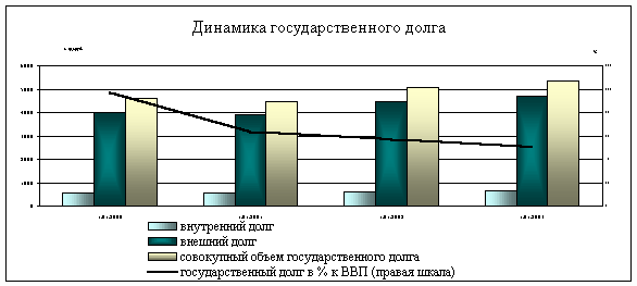 Вместе с тем, позитивные тенденции в развитии экономики, профицитная бюджетная политика государства, более эффективное управление государственными активами и пассивами заметно снижают остроту долговой проблемы. Динамика относительных затрат на обслуживание и погашение государственного долга свидетельствует, что ежегодные платежи по долговым обязательствам в процентах к ВВП сократятся за период 1999-2004 годы практически в 2 раза - с 10,8 до 5,6 процента, соответственно значительно снизится долговая нагрузка на федеральный бюджет.