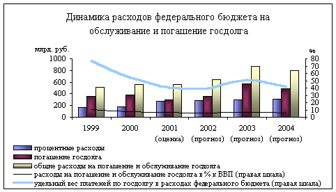 · Отсутствие единой системы управления государственным внутренним и внешним долгом в предыдущие годы в сочетании с произошедшей девальвацией рубля привели к довольно высокой долговой нагрузке на федеральный бюджет. Расходы федерального бюджета на обслуживание и погашение государственного внутреннего и внешнего долга будут и в дальнейшем занимать доминирующее положение в бюджетных расходах и оказывать негативное влияние на экономическую политику страны.