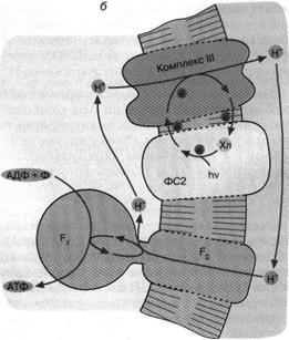 Рис. 5. Хлорофилльный фотосинтез зеленых серных (а) и пурпурных (б) бактерий: а - хлорофилл, связанный с особым белковым комплексом - фотосистемой 1 (ФС1), возбуждается квантом света и отдает электрон по цепи электронных переносчиков на НАД+. Восстанавливаясь, НАД* связывает внутриклеточный ион НГ. Потеря электрона на хлорофилле компенсируется окислением сероводорода до серы и иона ИГ снаружи бактериальной клетки. Движение Н+ внутрь клетки через комплекс F0 F1 дает АТФ; б - хлорофилл, связанный с белком фотосистемы 2 (ФС2), поглощает квант света и запускает циклический перенос электронов. В этом процессе участвуют переносчики электронов ФС2 и дополнительного белкового комплекса III. Перенос электронов комплексом III сопряжен с откачкой ионов Н+ из клетки. Откачанные ионы I-Г возвращаются через комплекс F0 F, с образованием АТФ
