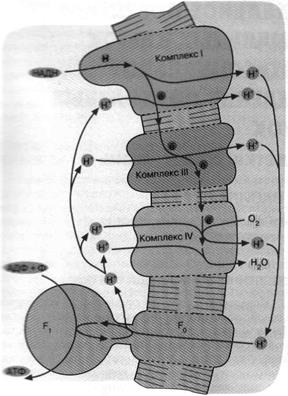 Рис.7. Механизм дыхательного фосфорилирования в аэробных бактериях и митохондриях. Ферментные комплексы I, III и IV катализируют перенос электронов от НАДН к О2 с образованием воды. Перенос электронов сопряжен с откачкой ионов Н*. Возвращение ионов Н+ через F0F1 приводит к синтезу АТФ