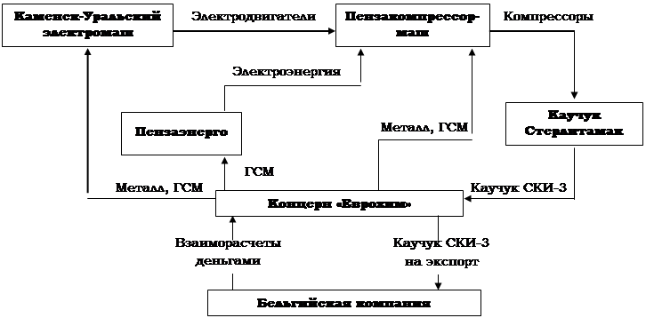В нашем примере поставки продукции осуществляются в пределах пяти предприятий: концерн «Еврохим», Каменск-Уральский электромаш, Пензаэнерго, Пензакомпрессормаш, Каучук-Стерлитамак. Основой взаимных расчетов служат долговые обязательства (векселя) задействованных предприятий.