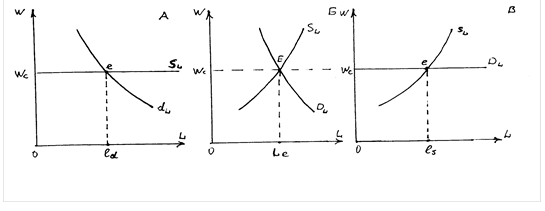 На крайнем справа графике В показано, что отдельный работник также должен принимать эту ставку зарплаты. Он сталкивается с абсолютно эластичным спросом на свой труд (DL) со стороны всех нанимателей. Иначе говоря, если он согласится на такую ставку зарплаты, то при желании и возможности, он сможет предложить сколь угодно много часов труда. Если же он потребует хоть чуть-чуть более высокую ставку, то он просто останется без работы (никто не наймет его по ставке выше Wc). При данной индивидуальной кривой предложения своего труда (sL) он «поставит» на рынок ls часов труда.
