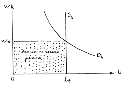 И, наконец, расположенный посередине график Б дает нам представление о рынке труда в целом. На нем пересекаются рыночные кривые спроса на труд (DL) и предложения труда (SL) и определяется общее равновесное количество труда (Le)