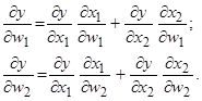 [8] Здесь применяется правило дифференцирования сложной функции. Если независимые переменные функции y = f(x1, x2) сами являются функциями других переменных, например, w1, w2, то y = f(x1, x2) дифференцируется как