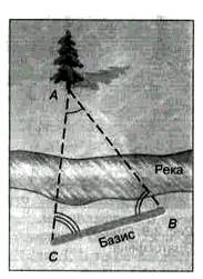 Определить географическую широту двух пунктов оказывается гораздо проще, чем измерить расстояние между ними. Зачастую непосредственное измерение кратчайшего расстояния между этими пунктами оказывается невозможным из-за различных естественных препятствий (гор, рек и т. п.). Поэтому применяется способ, основанный на явлении параллактического смещения и предусматривающий вычисление расстояния на основе измерений длины одной из сторон (базиса — ВС) и двух углов В и С в треугольнике АВС (илл. 2).
