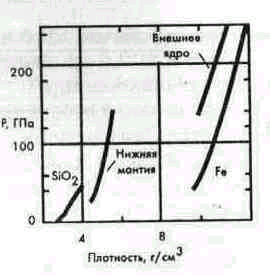 Зависимость плотности железа и двуокиси кремния и средней плотности нижней мантии и внешнего ядра от давления. Внешнее ядро примерно на 10% менее плотное, чем железо при соответствующих давлениях. Это позволяет утверждать, что ядро содержит расплавленные элементы, такие как сера и кислород
