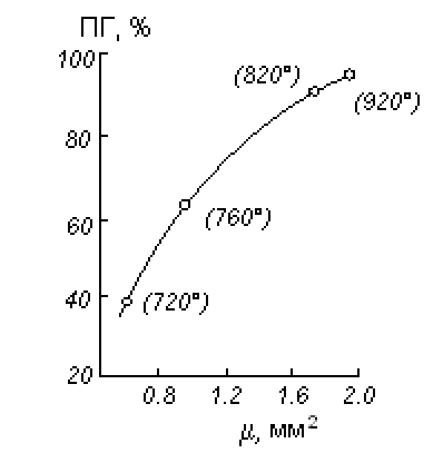 Рис.1 Зависимость показателя горячеломкости (ПГ) сплава алюминия с 4% Cu от размера зерна ( m ) при разном перегреве расплава.