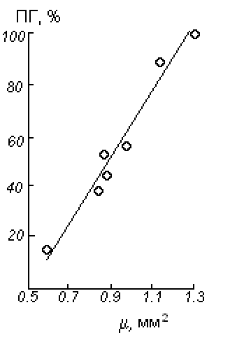 Рис.2 Зависимость показателя горячеломкости (ПГ) сплава меди с 3% Sn и 0.5% Fe от размера зерна (m ), полученного в разных плавках.