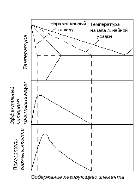 Эффективный интервал кристаллизации при добавлении к чистому металлу второго компонента возрастает, достигает максимума на концентрационной границе появления эвтектики и затем постепенно уменьшается до нуля в точке совпадения температуры начала линейной усадки с эвтектической горизонталью. Горячеломкость тем больше, чем больше эффективный интервал кристаллизации, и поэтому состав сплава должен совпадать с границей появления эвтектики. Это положение сыграло важную роль в изучении зависимости горячеломкости от состава, так как оно позволило связать сопротивляемость сплавов образованию трещин с диаграммой состояния и, в первом приближении, предсказать область составов наиболее горячеломких сплавов. Появление эвтектики и распределение её по границам кристаллитов в виде тонких прослоек существенно охрупчивает сплав, снижая его механические свойства, и, следовательно, его способность сопротивляться возникающим напряжениям. Кроме того, у сплавов с наибольшим эффективным интервалом кристаллизации линейная усадка в этом интервале получает максимальное
