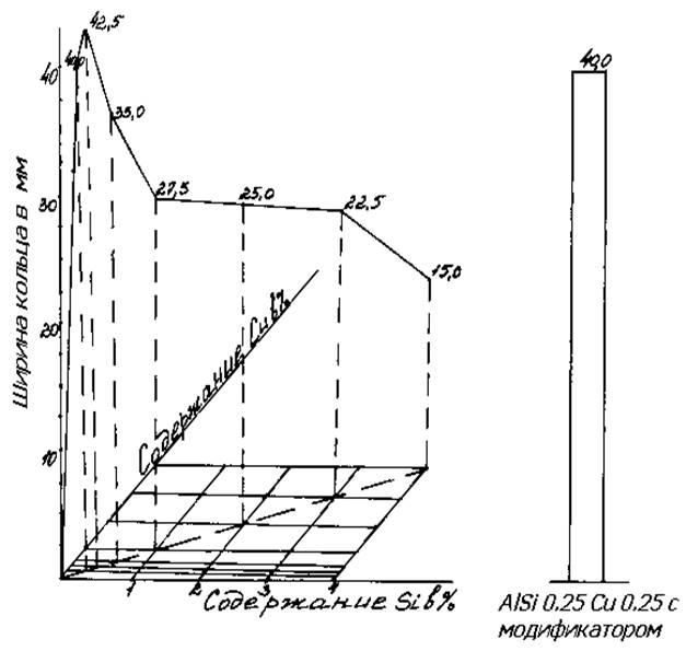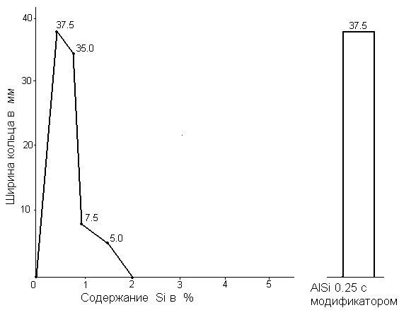 Al – Si 0.25, Al – Cu 0.5, Al – Si 0.25 – Cu 0.25. Величина горячеломкости этих сплавов различается незначительно и находится в пределах 37.5 – 42.5 мм по показаниям используемой кольцевой технологической пробы.