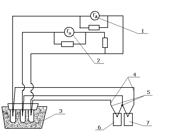 1 – дифференциальный гальванометр; 2 – простой гальванометр; 3 – сосуд Дьюара; 4 – дифференциальная термопара; 5 – простая термопара; 6 – образец; 7 – эталон.