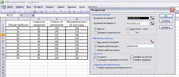 3. В диалоговом окне Регрессия в поле Входной интервал Y вводим адрес одного диапазона ячеек, который представляет зависимую переменную. В поле Входной интервал Х вводим адрес одного или нескольких диапазонов, которые содержат значения независимых переменных.