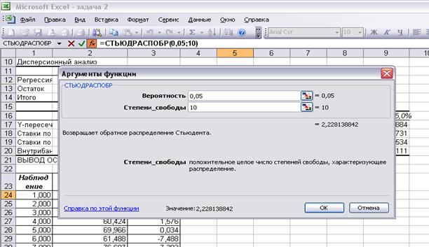 Расчетные значения также можно определить с помощью пакета анализа, функция СТЬЮДРАСПОБР: