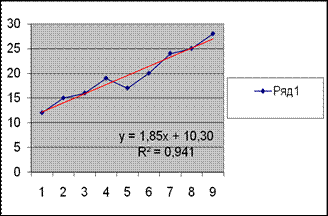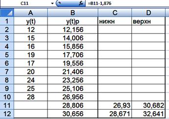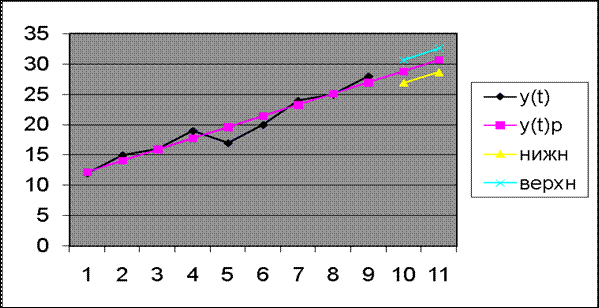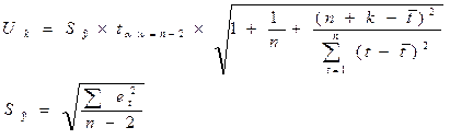 точечный прогноз получается путем подстановки в модель значений времени t, соответствующих периоду упреждения k: t = n+k. Так, в случае трендовой модели в виде полинома первой степени - линейной модели роста -экстраполяция на k шагов вперед имеет вид:
