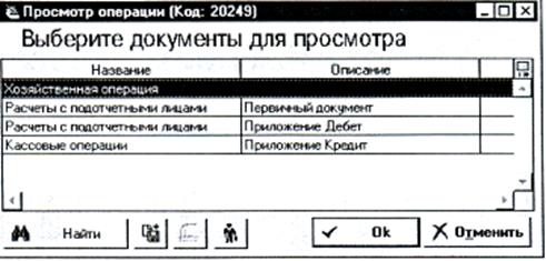 2 В таблице будут выведены записи о названии документа, а также приложений дебета и кредита. Двойное нажатие по записи в данном окне приведет к выводу на экран окна редактирования хозяйственной операции.