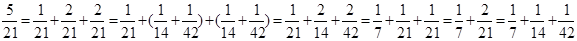 Но складывать такие дроби было неудобно. Ведь в оба слагаемых могут входить одинаковые доли, и тогда при сложении появится дробь вида 2/n. А таких дробей египтяне не допускали. Поэтому, папирус Ахмеса начинается с таблицы, в которой все дроби такого вида от 2/5 до 2/99 записаны в виде суммы долей. С помощью этой таблицы выполняли и деление чисел. Вот, например, как 5 делили на 21: