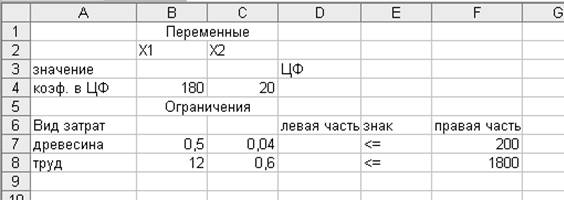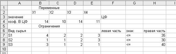 1. Создаем форму для ввода условий задачи. Запускаем Excel, выбрав Microsoft Excel из подменю Программы главного меню Windows.Открывается чистый лист Excel. Создаем текстовую форму – таблицу для ввода условий задачи.