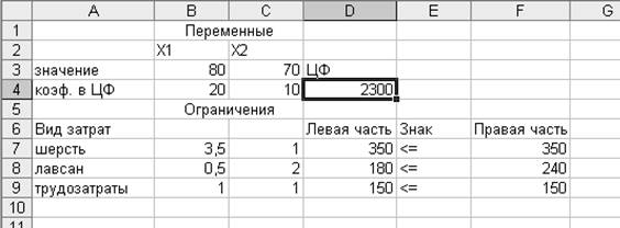 решение означает, что максимальная прибыль предприятия – 2300 ден.ед. будет достигнута