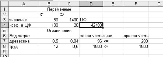 Через непродолжительное время появится диалоговое окно Результаты поиска решения и исходная таблица с заполненными ячейками В3:С3 для значений Х1 и Х2 и ячейка D4 с максимальным значением целевой функции.
