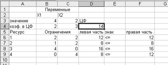 Полученное решение означает, что максимальная прибыль 14 ден. ед. будет достигнута при продаже 4-х товаров 1-го вида и 2-х товаров 2-го вида. При этом 1, 2, 3 ресурсы будут использованы полностью, а из 12 ед. 4-го ресурса будет использовано 8.