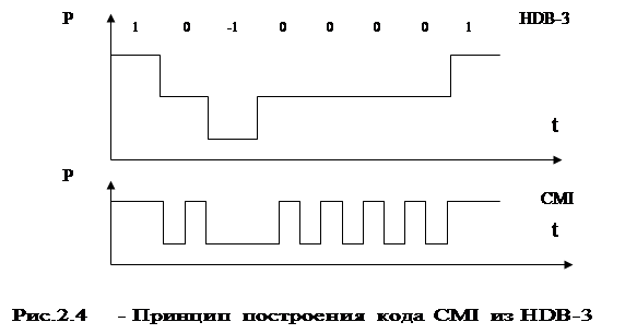 В современных оптоволоконных системах связи для городской телефонной сети ИКМ-120-4/5 и ИКМ-480-5 для передачи в качестве линейного кода используется код CMI, отвечающий большинству вышеперечисленных требований. Особенностью данного кода является сочетание простоты кодирования и возможности выделения тактовой частоты заданной фазы с помощью узкополосного фильтра. Код строится на основе кода HDB-3 (принцип построения представлен на рис.2.4). Здесь символ +1 преобразуется в кодовое слово 11, символ –1 –в кодовое слово 00, символ 0 -в 01. Из рисунка 2.4 видно, что для CMI характерно значительное число переходов, что свидетельствует о возможности выделения последовательности тактовых импульсов. Текущие цифровые суммы кодов имеют ограниченное значение. Это позволяет контролировать величину ошибки достаточно простыми средствами. Число одноименных следующих друг за другом символов не превышает двух – трех. Избыточность кода CMI можно использовать для передачи служебных сигналов.