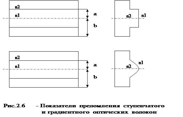 Различают световоды со ступенчатым профилем, у которых показатель преломления сердцевины n1 одинаков по всему поперечному сечению, и градиентные - с плавным профилем, у которых n1 уменьшается от центра к периферии (рис.2.6).