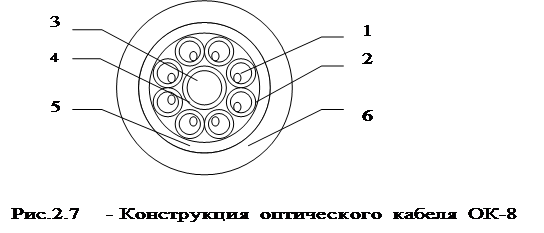 На сегодняшний день промышленностью выпускаются оптические кабели имеющие четыре и восемь волокон(марки ОК). Конструкция ОК-8 приведена на рис.2.7. Оптические волокна 1 (многомодовые, ступенчатые) свободно располагаются в полимерных трубках 2. Скрутка оптических волокон – повивная, концентрическая. В центре – силовой элемент 3 из высокопрочных полимерных нитей в пластмассовой трубке 4. Снаружи – полиэтиленовая лента 5 и оболочка 6. Кабель ОК-4 имеет принципиально те же конструкцию и размеры, но четыре ОВ в нем заменены пластмассовыми стержнями.