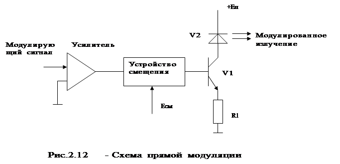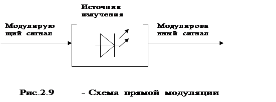 Прямая модуляция. При этом модулирующий сигнал управляет интенсивностью (мощностью) оптической несущей. В результате мощность излучения изменяется по закону изменения модулирующего сигнала (рис.2.9).