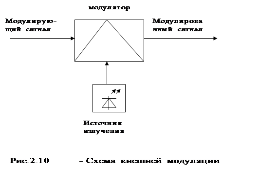 Внешняя модуляция. В этом случае для изменения параметров несущей используют модуляторы, выполненные из материалов, показатель преломления которых зависит от воздействия либо электрического, либо магнитного, либо акустического полей. Изменяя исходными сигналами параметры этих полей, можно модулировать параметры оптической несущей (рис.2.10).