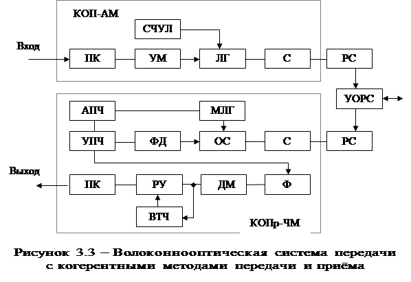 В схеме этой группы (рисунок 3.3) применены когерентные методы передачи и приема оптического сигнала, амплитудная (для одного направления передачи) и частотная (для другого направления) модуляция сигнала. В отличие от волоконнооптической системы передачи первой группы (рисунок 3.1), оптические передатчики – когерентные (КОП) и содержат системы стабилизации оптической частоты и формирования узкой линии излучения (СЧУЛ) и блоки, обеспечивающие обработку сигналов с заданной модуляцией.