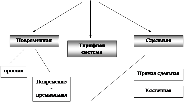 2) Порядок исчисления заработной платы работникам всех категорий регламентируют различные формы и системы заработной платы. Формы и системы заработной платы (см. рисунок №2) - это способ установления зависимости между количеством и качеством труда, то есть между мерой труда и его оплатой. Для этого используются различные показатели, отражающие результаты труда и фактически отработанное время. Иными словами, форма оплаты труда устанавливает, как оценивается труд при его оплате: по конкретной продукции, по затраченному времени или по индивидуальным или коллективным результатам деятельности. От того, как форма труда используется на предприятии, зависит структура заработной платы: преобладает ли в ней условно- постоянная часть (тариф, оклад) или переменная ( сдельный приработок, премия). Соответственно разным будет и влияние материального поощрения на показатели деятельности отдельного работника.