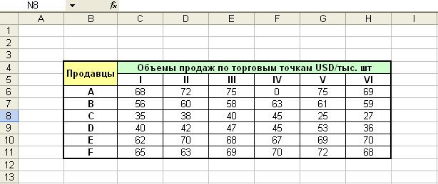 В распоряжении некоторой компании имеется 6 торговых точек и 6 продавцов. Из прошлого опыта известно, что эффективность работы продавцов в различных торговых точках неодинакова. Коммерческий директор компании произвел оценку  деятельности каждого продавца в каждой торговой точке. Результаты этой оценки представлены в таблице.