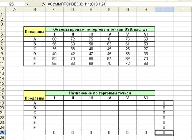 1. Значения переменных  располагаются в блоке ячеек С19:H24, в ячейку I25 вводим формулу для вычисления целевой функции, формулы для вычисления ограничений по назначению на торговые точки (I19=СУММ(С19:Н19) и т.д.) и формулы для вычисления ограничений по продавцам (С25= СУММ(С19:С24) и т.д.)