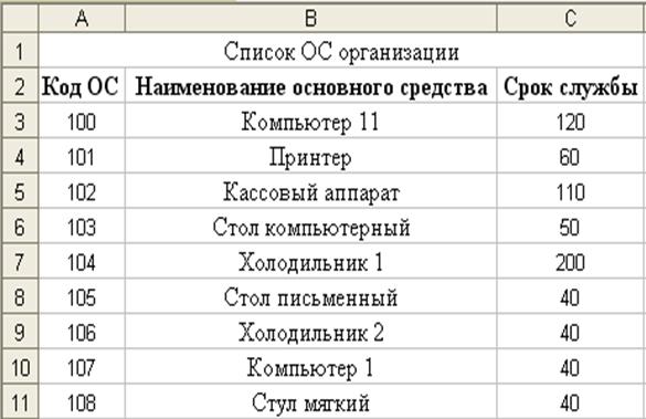 Рис.1. Расположение таблицы «Список ОС организации» на рабочем листе Основные средства MS Excel