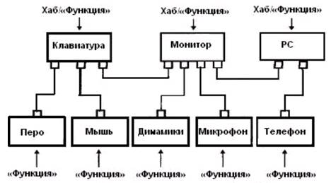 Питание устройств USB возможно от кабеля (Bus-Powered Devices) или от собственного блока питания (Self-Powered Devices). Хост обеспечивает питанием непосредственно подключенные к нему ПУ. Каждый хаб, в свою очередь, обеспечивает питание устройств, подключенных к его нисходящим портам. При некоторых ограничениях топологии допускается применение хабов, питающихся от шины. На рис. 2 приведен пример схемы соединения устройств USB. Здесь клавиатура, перо и мышь могут питаться от шины.