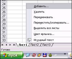 2. Добавим еще 3 листа: нажав правой кнопкой мыши на ярлыке листа 1 и выбрав в меню «Добавить» затем «Лист». Повторим процедуру еще два раза (Рис. 7)