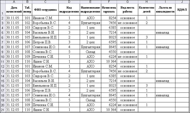 3. На листе 1, начиная с ячейки А1 введем следующие исходные значения из таблицы «Подразделения».