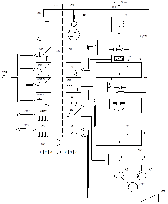 ФИ – усилитель – формирователь; БТ – блок тормозной; Ф1,Ф2,Ф3 – фильтр; ПКА – блок выходных программ; ВБ – блок вентиляторов; ИП – многоканальный источник питания; Д – блок датчиков; ДН, ДТ – блок защит; МК – программный микроконтроллер; ДЧВ – датчик частоты вращения; РА – блок линейной автоматики; ИРПС – каналы интерфейсной связи.
