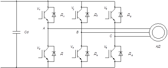 Cd – ёмкость входного фильтра;V1- V6 – IGBT – транзисторы; Д1-Д6 – диоды; АД – асинхронный двигатель.