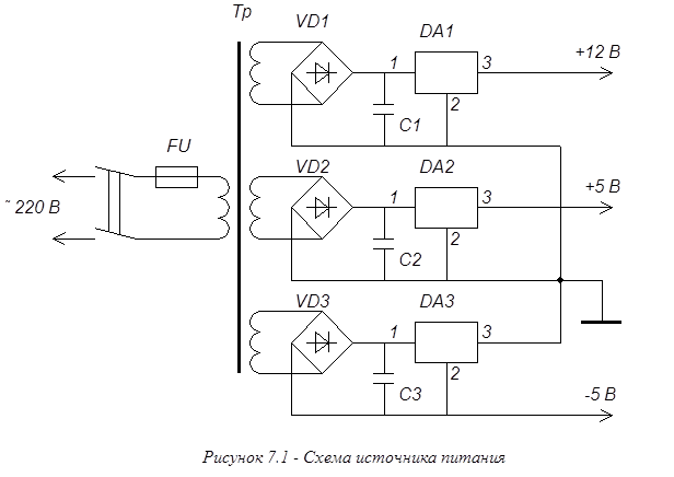 В разрабатываемом микропроцессорном блоке необходимо использование трех питающих напряжений постоянного тока: +5, -5 и +12 вольт, следовательно, источник питания будет состоять из следующих основных узлов: трансформатор, три независимых выпрямителя, фильтра и стабилизатора.
