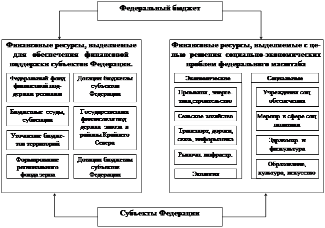 Одной из центральных проблем бюджетного федерализма является бюджетное выравнивание, которое подразделяется на вертикальное и горизонтальное (эти понятия пришли к нам из зарубежной практики). Вертикальное выравнивание - это процесс достижения баланса между объемом обязательств каждого уровня власти по расходам с потенциалом его доходных ресурсов (налоговых поступлений). На вышестоящий уровень накладываются обязательства: в случае, если потенциальные возможности по обеспечению доходной части на нижестоящем уровне недостаточны для финансирования возложенных на него функций, центральное правительство обязано предоставить этому региональному или местному органу власти недостающие бюджетные ресурсы. Центральное правительство, обладая гораздо большими, чем любой регион, возможностями экономического регулирования и объемами налоговых поступлений, должно компенсировать дисбаланс региональных бюджетов за счет средств, аккумулированных на уровне федерального бюджета. Вертикальное выравнивание непременно должно сочетаться с горизонтальным, означающим пропорциональное распределение налогов и дотаций между субъектами Федерации для устранения неравенства в возможностях различных территорий, вызванных территориальным фактором. Таким образом, получается, что к расходам федерального бюджета на решение социально-экономических задач федерального масштаба добавляются еще и расходы на достижение сбалансированности бюджетной системы (см. Рис. 1.1)