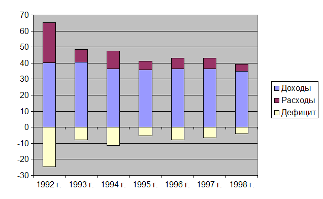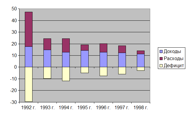 Из-за спада производства резко сократились база налогообложения и доходы бюджетов всех уровней. Расходы бюджетной системы (социальные гарантии, правоохранительная деятельность, управление и т.п.) становятся непосильными для слабеющей экономики. Но политические, социальные и иные соображения не позволяют прекратить финансирование государственных расходов, не покрываемых доходами. Региональные власти используют любые возможности для получения финансовой поддержки из федеральной казны.[1]