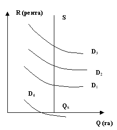 Рассмотрим ренту, получаемую владельцами земли. В целях упрощения мы будем считать, что вся имеющаяся в стране пахотная земля обладает одинаковой урожайностью и используется для производства зерна. Рынок земли совершенно конкурентен, т.е. имеется значительное количество и владельцев земли, и зерноводческих хозяйств. Поскольку суммарное количество земли фиксировано, то ее суммарное предложение абсолютно неэластично, и кривая предложения земли вертикальна (рис.1). Кривые же суммарного спроса (D1, D2, D3) имеют обычное очертание: для земли,