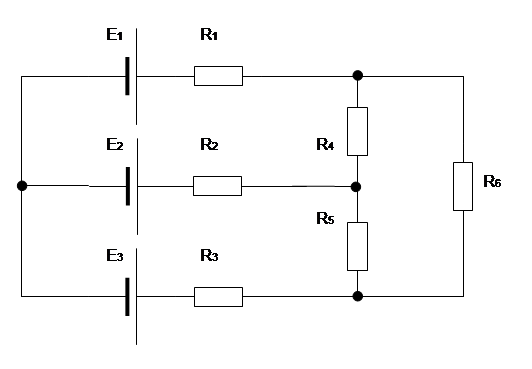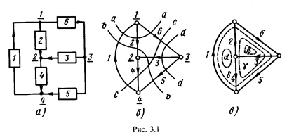 В результате получается электрическая схема, имеющая определенную геометрическую конфигурацию. На рис. 4 приложения показан пример схемы электрической цепи, составленной из нескольких сопротивлений и источников ЭДС.