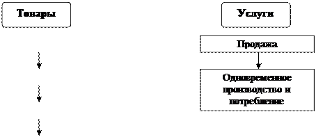 Оказать услугу можно лишь тогда, когда поступает заказ или появляется клиент. Различие между товарами и услугами с точки зрения взаимосвязи производства и потребления характеризует рис.1.1.