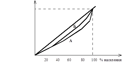 Линия А отображает неравенство в распределении доходов до уплаты налогов. Линия Б показывает, что прогрессивные налоги приводят к более равномерному распределению доходов, остающихся после уплаты налогов. Влияние их представлено на рисунке, естественно, в преувеличенном виде, чтобы лучше выявить суть вопроса.