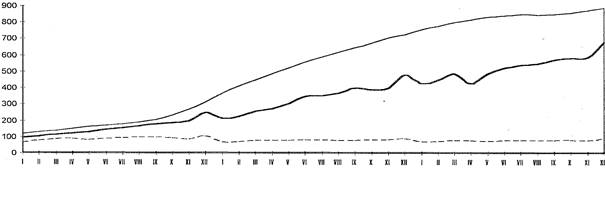 В последние годы четко прослеживается процесс перехода от количественного к качественному развитию банковской системы. В 1994 г. количество банков увеличилось на 500, или 1/4, а в 1995 г. сократилось на 140. В 1996 г. эта тенденция сохраняется, количество банков уменьшилось более чем на две сотни.