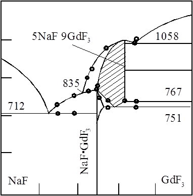 Из диаграмм состояния бинарных систем типа MIIICl3 - MICl, где MIII – РЗЭ; MI – щелочной металл, следует, что все хлориды РЗЭ образуют конгруэнтные либо инконгруэнтные соединения с хлоридами K, Rb, Cs. Для хлорида натрия такие соединения образуют РЗЭ, начиная с самария.