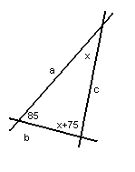 В данном случае имеем: 75°+х°+х°+85°=180°. Отсюда: х=10°. |